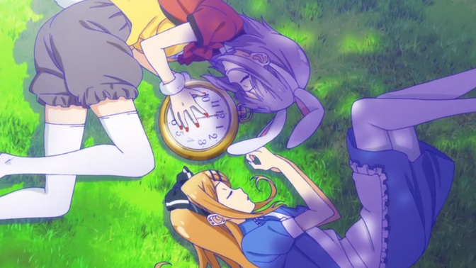 以粗点心为主题的电波系对白与超有病的日常,人设还算精致。女主负责无脑耍宝与商业卖肉,整天闲得没事做去男主商店里骗吃骗喝,甚至吃零食吃出戒断症状。男主在两个女主之间摇摆不定,整个番就是五个人在这个小镇里的粗点心店中插科打诨的无聊故事。然而就是这样也有让观者不知不觉看完的吸引力。 |