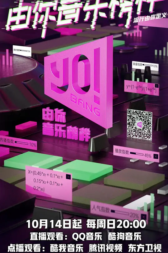 《由你音乐榜样》(YO! BANG)是结合TME腾讯音乐娱乐首次联动旗下三平台(QQ音乐、酷狗音乐、酷我音乐),打通音乐数据所推出的“由你音乐榜”榜单 ,而重磅推出的C-POP潮流音乐打榜节目