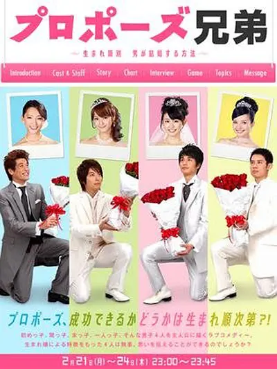 简介:看片狂人(www.kpkuang.com)为您奉上日本电视剧《求婚兄弟~按出生顺序男人结婚的方法~》的免费在线观看,《求婚兄弟~按出生顺序男人结婚的方法~》是对白语言为日语,属于喜剧,爱情类型,目前在豆瓣的评分为7.2分,有2242名网友参与打分,最后祝您观影愉快,本页面也会及时添加或更新本片(剧)的最新播放源。以下是剧情简介: 2011年2月21日起,4夜连续播放的SP。 生まれ順で性格が異なる初めっ子・間っ子・末っ子の3兄弟と一人っ子である彼らの従兄弟がそれぞれ女性にプロポーズする姿を描くラブコメディー。