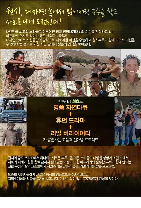 金炳万的丛林法则是一部以生产和丛林冒险为主题的韩国真人秀艺能节目。 第一回非洲纳米比亚篇中金炳万族长带领歌手ZE:A组合成员黄光熙,演员Ricky Kim以及演员柳谭一起进入海拔1000米以上,拥有22个国家公园和全世界最古老沙漠的纳米比亚并且拜访被称为红太阳战士的非洲最后的保持原始生态的民族——辛巴族,为了维护他们的传统,他们选择了退守丛林,栖身于纳米比亚边远的、未被破坏的原始环境中。金炳万族长要怎样...... 完整简介请见下方