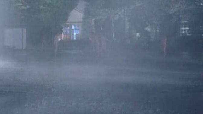 少女たちが雨の中、歌をうたいながら全裸になって踊っています。 |