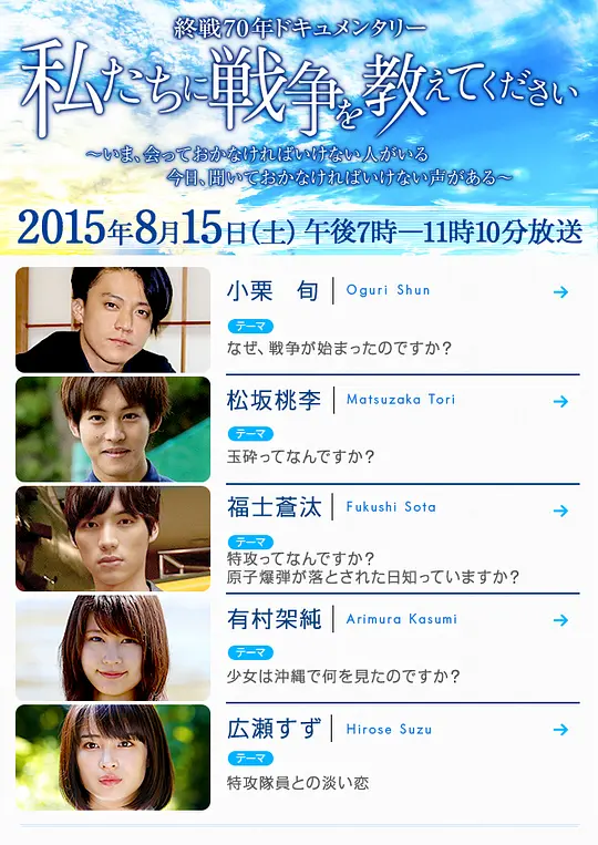 终战70周年时播放的纪录片。很贴近年轻人,几个年轻艺人来到战争时期,告诉所有人那时到底发生了些什么。没有任何批判性的评论,只是讲述了当时平民、军人(包括对手)的真实想法。当时的生活真的是我们难以想象的苦难 |