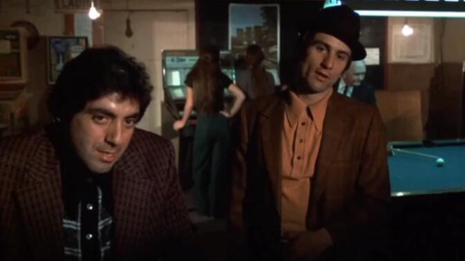 听过安迪沃霍讲罗伯特德尼罗在纽约地下表演坎普喜剧一次分饰十个角色的故事,就再也无法正视德尼罗的迷之微笑了,因为你不知道他要表达的是喜欢你,还是骂你坏到鸡鸡眼里去了。戏中的德尼罗就是游走于穷街陋巷的汽油燃烧弹,他既是玩世不恭也是无所畏惧,羞辱黑帮头子后还在汽车旁跳舞的镜头堪称经典。斯科塞斯尤其喜欢用街头类比社会,黑手党用意大利语进行的高层会议对于上进职员来说,就像是火中的权力幻觉,旺角卡门里的乌蝇哥愿意为此付出生命,因此才显得德尼罗的无所谓更加可贵,权利魔法算什么,看我用爆竹炸飞垃圾桶! |