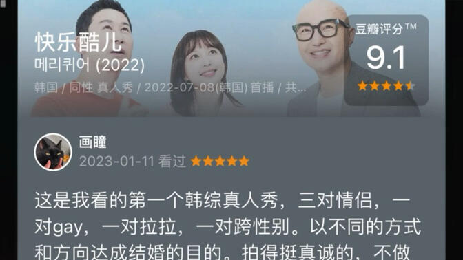 《出柜罗曼史》合集【韩国首部 L.G.B.T.Q 题材综艺】《Merry Queer / 酷儿快乐》中字1080P:https://www.bilibili.com/video/BV1Bt4y1b7cU —— 曾经拍影视,如今拍综艺(有些像是把LGBTQ真实生活Vlog制作成节目的感觉)……希望韩国也能早日实现同性婚姻合法化! |