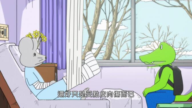动画里鳄鱼和青蛙从背后看很像,象征着什么呢?青蛙君成为了老鼠的朋友,带着大家走出失去好友的阴影,挺好。 |