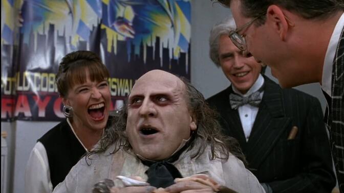 8/10。重温。波顿的黑暗童话气息和漫画最接近,故事背景是圣诞节,而波顿张扬的幻想主义也宛如节日的狂欢,马戏团从巨大的礼物盒里蹦出,从箱子里开枪、吐火焚烧商店,以庆典游行的方式策划恐袭,而企鹅人居住的动物园建立在冰雪荒地之上,装饰着中世纪风格的栏杆和雕像,动物元素为这象征着恐怖和疯癫的世界增加了魔幻感:猫女坠楼后大量的灵猫经过她身边,以咬她手指的方式救醒她;被人类社会遗弃的企鹅人死后,被企鹅拖入水中送葬,许多魔幻的意象和边缘人、利益交换的黑暗主题相呼应。企鹅人一出生就被父母面无表情地关在笼中,放在婴儿车里抛入下水道,比起坏人他更是被愿望心理支配的儿童,马克斯拿出一条金枪鱼诱惑企鹅人跟着下楼的情景像陌生人用糖果诱骗小孩,他竞选市长成为马克斯实现利益的工具,显然企鹅人的边缘人形象带有波顿的同情色彩。 |