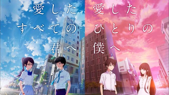 两部合标。致我和致你从标题到内容都互为表里,前者正序,后者倒序,不同世界线在结尾交汇。核心设定是平行世界,堆砌一些诸如虚质科学和事象半径的名词来填充框架。致我展现的是历终其一生去研究如何改变栞的死亡,最终得出的结论是抹去两人的相遇,“活着和死去的温度差就是生命的真谛”。缺点和槽点较多,如两人出入研究所随意使用器械,飞来横祸和情侣变兄妹多少有些狗血,加上声优的棒读和显眼的广告植入,评价略低于致你;而致你通过倒序在结尾揭秘让情感冲击更胜一筹,栞在电影中像是一个符号,化作十字路口幽灵的她是历的执念,和音才是标题中的讲述者,无论你跳跃到哪个世界,都会有深爱你的我出现。配乐没有存在感,但主题曲和两段插曲的片段表现不错。另外,两部电影别出心裁地同时上映,选择不同观看顺序的观众也像是做出了平行世界的决定。 |