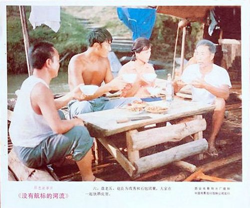 巧妙地在江上构建了一个第三空间,角色们漂流在土地上的政治斗争之外,获得了暂时的安全感,可以自由地表达想法,被追捕的改秀也能够生活在阳光之下,不怕被人看见。放排人是漂泊的职业,他们不定期上岸,生命也收到威胁,然而感情需要稳定,这两种动与静的矛盾,让放排人只能忍受身心上的孤独,坚信总有位佳人在水一方。对这类情感的描绘,与谢晋的电影有相似之处,都同属于伤痕电影的序列之中。底层市民们守望相助,在排上组成新的家庭,坚信用爱能够冲淡政治所带来的伤害。滔滔江水也寓意着时事的变迁,排是生命,需要不时地忽左忽右,才能够做到安全前行。由于职业的特殊性,吴天明还充分展现了男性的肌体,与孙瑜电影中的健壮相对,吴天明眼中的身体已是几经风吹雨打后的垂垂老矣。 |