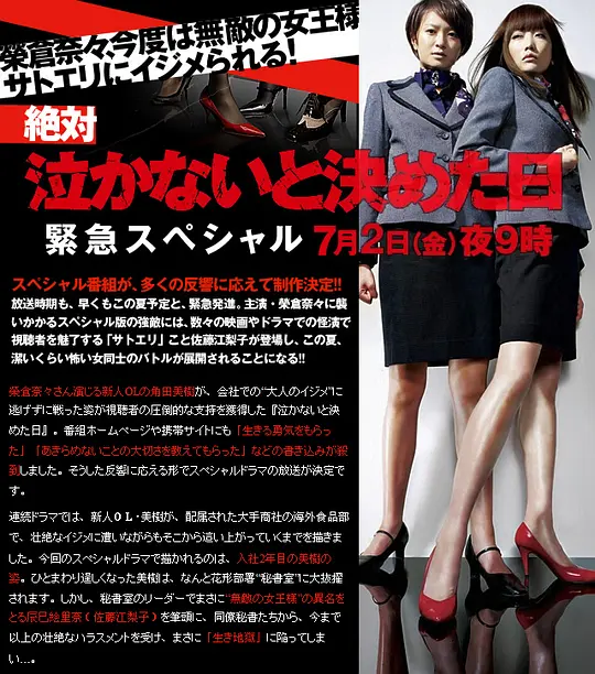简介:看片狂人(www.kpkuang.com)为您奉上日本电影《绝对不哭的日子~紧急SP》的免费在线观看,《绝对不哭的日子~紧急SP》是对白语言为日语,目前在豆瓣的评分为6.4分,有801名网友参与打分,最后祝您观影愉快,本页面也会及时添加或更新本片(剧)的最新播放源。以下是剧情简介: 榮倉奈々さん演じる新人OLの角田美樹が、会社での“大人のイジメ”に逃げずに戦った姿が視聴者の圧倒的な支持を獲得した『泣かないと決めた日』。番組ホームページや携帯サイトにも「生きる勇気をもらった」「あきらめないことの大切さを教えてもらった」などの書き込みが殺到しました。そうした反響に応える形でスペシャルドラマの放送が決定です。 ...... 完整简介请见下方
