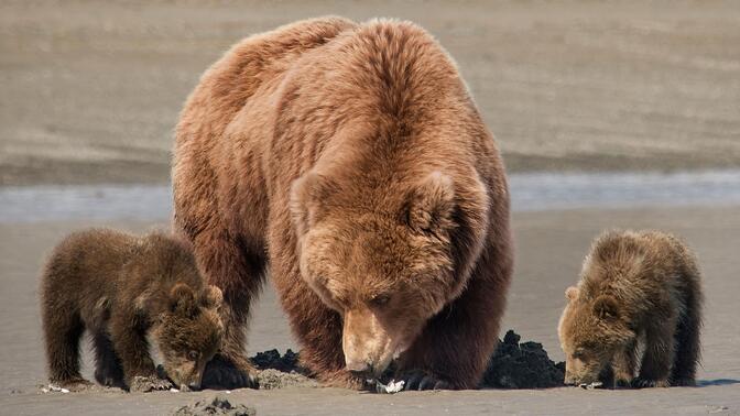 熊的世界有草,有贝类,有海边嬉戏,还有鲑鱼和冬眠,更有一只萌萌的狼。 |