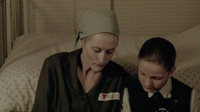 注意苏菲的两次“晕倒”。第一次发生在图书馆借阅艾米莉狄更斯的诗,管理员竟不知此人存在更态度粗暴,让她转身晕倒,随即内森出现,原地照看呵护了她,并赞她很美丽,还预测她能活到一百岁;第二次发生在闪回段落中,她去偷广播被纳粹军官的女儿发现,情急辩解无果身子一晃晕倒在地。奇怪地是,这位德国女孩并没跑开向父亲告发,而是扶起她,使她苏醒,并夸她漂亮……诸位,看到惊人相似性了吗?苏菲在两个迥然不同的时空情境中竟然同样在:1、渴望获取某物,诗集或广播,并遭遇了失败;2、被粗暴言语直怼后突然晕倒在地;3、可马上就接受了温柔呵护并被夸美丽。于是问题来了:导演帕库拉想要借助这两段时序并不毗邻彼此间隔一个多小时候的相似段落暗示什么呢?倘若再想想内森说她能活一百岁可结果最终我们看到的却是……激灵一个冷战,有点细思渐恐! |